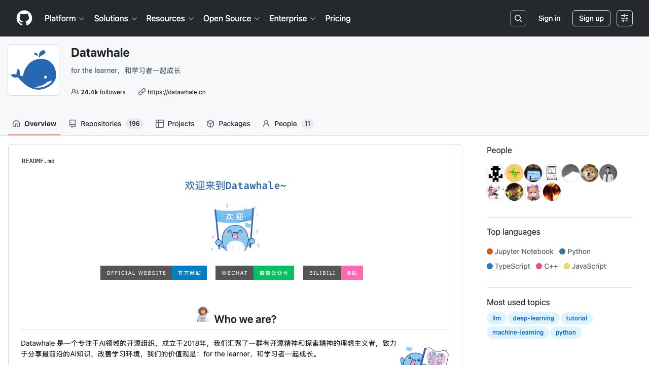 国内最大的 AI 开源学习社区,GitHub 上有 LLM、Agent、CV、NLP 等系统课程,全部免费。定期组队学习,有助教答疑,适合从零开始系统学 AI。推荐从「动手学大模型」开始。